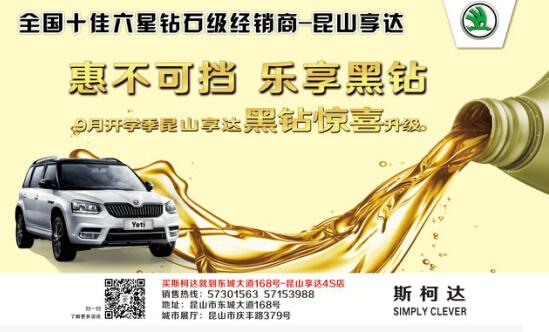 9月開(kāi)學(xué)季昆山享達斯柯達黑鑽機油驚喜升級,斯柯達尊貴車主到店進(jìn)行保養時(shí),原灰殼可免費升級黑鑽,常保車主88折惠享黑鑽。機不可失!一同來享受殼牌黑鑽高端機油極護尊享體驗吧!