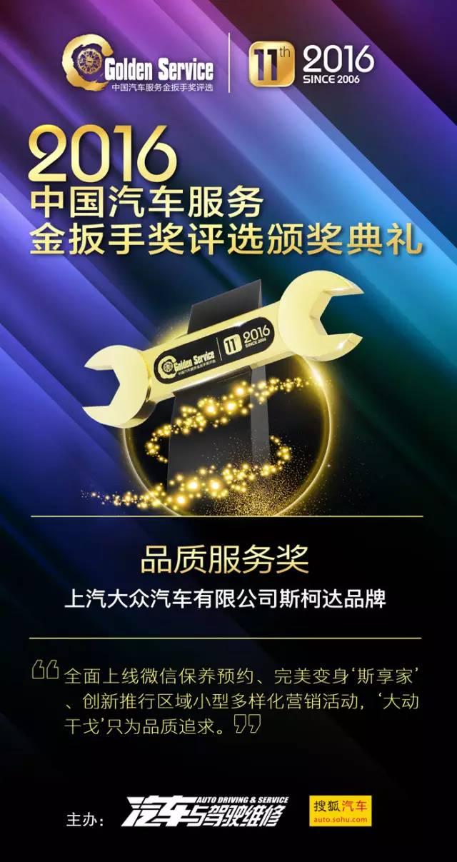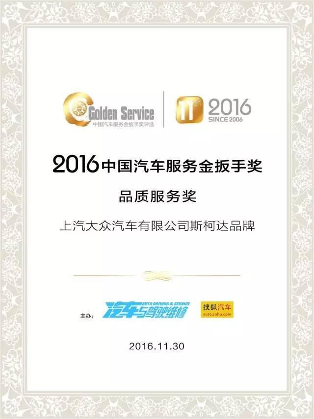 11月30日,由《汽車與駕駛維修》雜志和搜狐汽車聯但區合發(fā)起(qǐ)、主辦的身你“2016中國(guó)汽車服務金扳手獎評選”榜單正式揭曉,上汽大衆斯柯達品牌憑借在售後(hòu)服務領域的優異表現,再度離南蟬聯“2016年中國(guó)汽車服務金扳手獎——品質服務獎”。此次獲獎是斯柯達品牌繼2007年獲得“金扳手服務新秀獎”以來,連續第十年問鼎這(zhè)一行業權威評選。