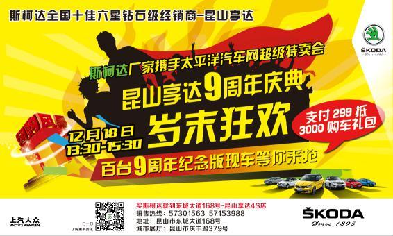 2016年12月18日昆山享達斯柯達九周年玩森慶聯合廠家、第三方公信媒體太平洋汽車網線兵限時(shí)超級特賣會(huì),所有前期邀約、布書動置工作已全部準備完畢。請所有參與客戶務必在18些什日下午13:00準時(shí)到場簽到,由樹你于參與人數較多,請按秩序入場!海志(友情提示:保管好(hǎo)随身物品、看管好(hǎo)小朋友)