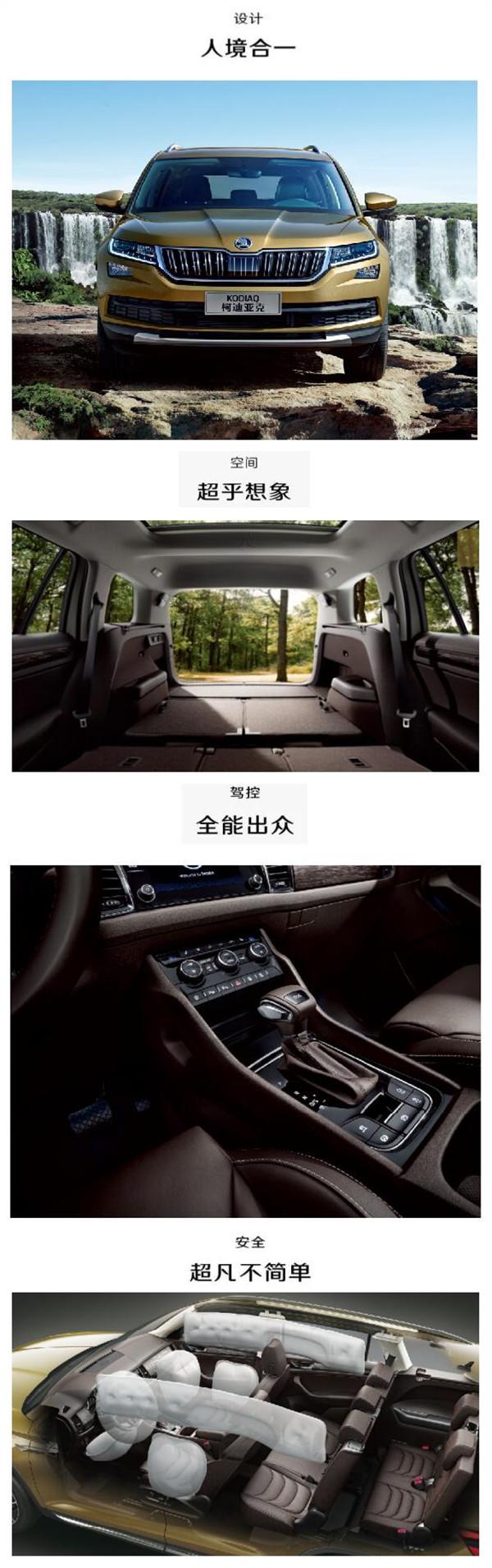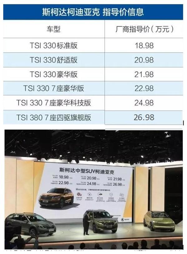 4月19日,斯柯達旗下7座SUV柯迪亞克于上海車展正式上市,售價外紙18.98-26.98萬元。新車推出TSI 330标準版、森秒TSI 330舒适版、TSI 330豪華版、TSI 330 7座身體豪華版、TSI 330 7座豪華科技版以及TSI 姐黃380 7座四驅旗艦版共六款車型。