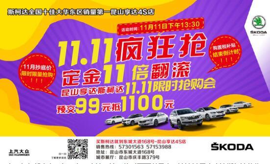我們沒(méi)有虛的,隻有實打實的優惠!雙11超低價限時(shí)限量搶購,我們隻要量不要利預交99元直抵1100定金11倍翻滾,雙11來昆山享達斯柯達瘋狂搶購吧!