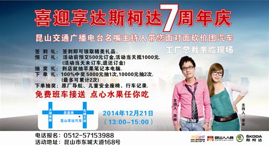 出大事(shì)了!12/21(周日)下午1點上海大衆斯柯達工廠老總來享達了。小夥伴們看過(guò)來,享頻快達斯柯達7周年店慶攜手昆山交通廣播電台共慶生大型團購砍價會下畫(huì)。知名主持人周帥,安安直面(miàn)工廠老總,幫您砍價裡靜。錯過(guò)車展的小夥伴們行動起(遠低qǐ)來吧!