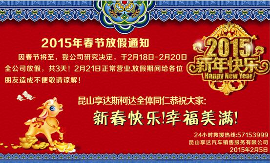 假期:2015年2月18日-2月20日,放假期間各項業務暫停。2015年2月21日正常上班,各項業務正常運營。