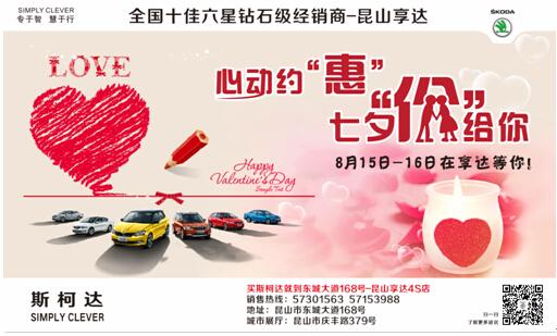 真實感悟、真愛生活、相約七夕、真愛廠得永恒,趕緊帶著(zhe)您的愛人來昆山享達斯柯達選購一款愛車,讓斯柯達爲您票站的愛人、家庭保駕護航,幸福一生。請腦8月15日-8月16日昆山享達開(kāi)展“心動約惠,七夕價給你”活動,趕緊搶車吧!