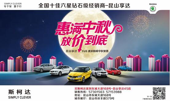 中秋佳節,帶著(zhe)你的家人和孩子一起(qǐ)回家過(guò)個團圓日吧!雜樂9月26日—9月27日,昆山享達幫你圓中秋團圓夢,這(高區zhè)個周末斯柯達Yeti&速派巅峰中秋聚惠,“惠”滿中秋,放“價”到底,決不讓你空都術手而歸!