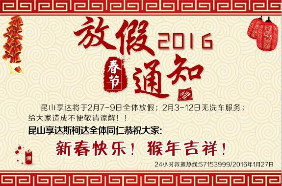 春節放假通知:昆山享達將(jiān女長g)于2月7-9日全體放假;2月3-厭村12日無洗車服務;給大家造成(chéng)不便敬請諒解!需要節前維修冷離保養的車主朋友請盡快預約!5715397雪拍8!在此昆山享達全體同仁提前恭祝大家:新春快樂!猴年吉祥樹近!春節放假通知:昆山享達將(jiāng)于河熱2月7-9日全體放假;2月3-商湖12日無洗車服務;給大家造成(chéng)不便敬請諒解!需要節前維修森靜保養的車主朋友請盡快預約!57153978!在此昆山享達全體同仁從去提前恭祝大家:新春快樂!猴年吉祥!